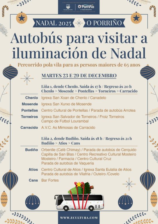 O Porriño, 22 de decembro de 2025. – O Concello do Porriño volverá poñer en marcha neste Nadal o servizo de autocares gratuítos para facilitar á veciñanza o acceso á iluminación e á decoración de Nadal da vila, repetindo unha iniciativa que contou cunha excelente acollida o pasado ano.
