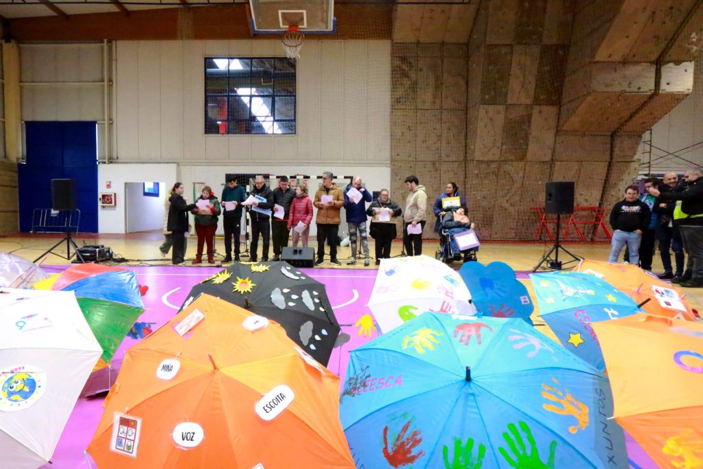 A continuación celebrouse o tradicional concurso de paraugas, no que se puideron contemplar diversos deseños todo eles con mensaxes reivindicativas, resultando gañador o elaborado polos escolares do CEIP Antonio Palacios. O momento central da xornada foi a lectura do manifesto do grupo de autoxestores de Aceesca, “Os Dez de Porriño”, que fixeron un chamamento contundente a derrubar barreiras e garantir os dereitos das persoas con diversidade. No seu texto, lembraron que “non só é un día para celebrar a nosa fortaleza, senón tamén para esixir os cambios necesarios que nos permitan formar parte da sociedade dunha maneira plena, activa e equitativa”. Reivindicaron tamén a necesidade dun traballo digno, a accesibilidade universal física e cognitiva, e unha sociedade que respecte dereitos fundamentais como o da non discriminación, a ter familia, saúde con atención especializada, identidade propia, liberdade de expresión, privacidade, vivenda digna e unha vida independente. “Queremos que se escoite a nosa voz e que se respecten os nosos dereitos. Reivindicamos todo isto porque desexamos vivir nunha sociedade na que a diversidade sexa sinónimo de oportunidades para todos e todas”, proclamaron.